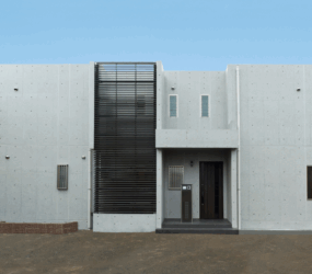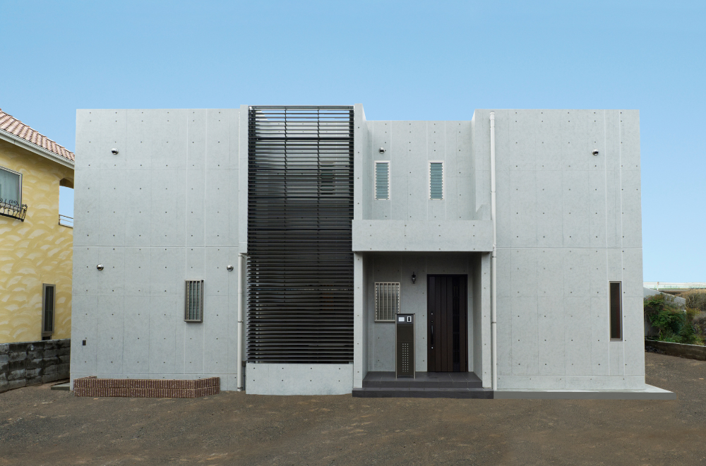 打ち放しコンクリートと縦格子のファサードが融合した邸宅。モノトーンの美しさと静けさの中に、強さと個性が際立つデザインです。