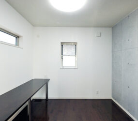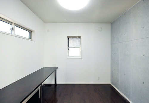 コンクリートの壁で囲まれた個室は、趣味である音楽鑑賞を、近所を気にせず大音量で楽しむことができます。また、こだわりであるコンクリート打ち放しを室内にも取り入れています。