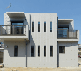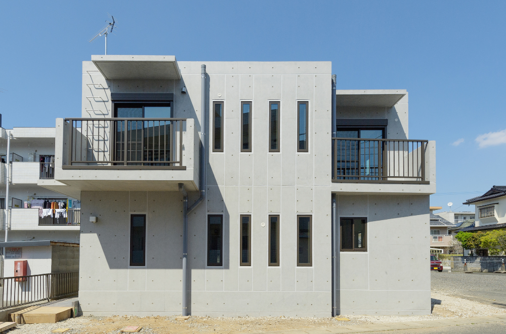 打ち放しコンクリートの直線美と縦長スリット窓が印象的な、シンメトリーデザインの2階建ての邸宅。