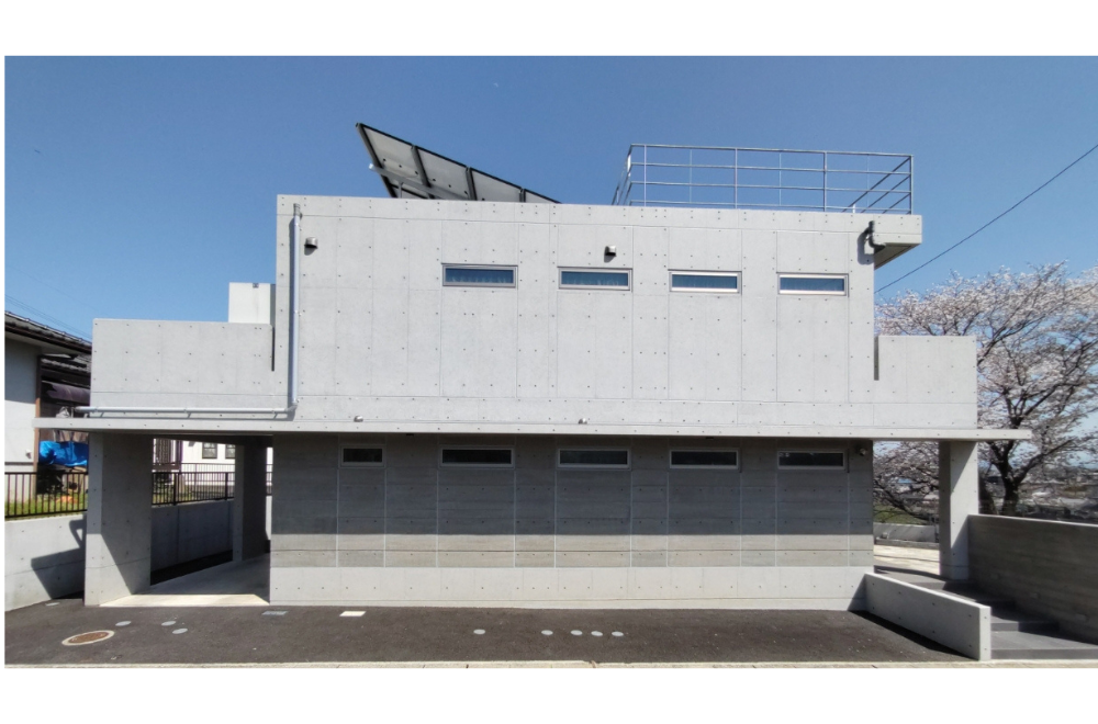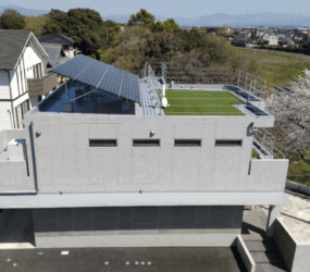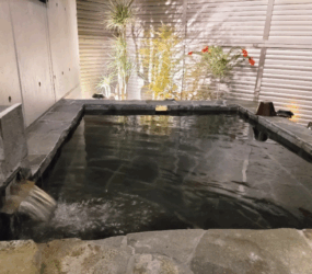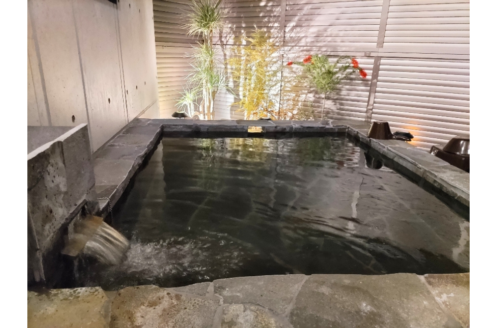 無駄をそぎ落としたデザインが、時を経ても色褪せない存在感を放ちます。屋根に広がるソーラーパネルと、緑の屋上。静寂に包まれる、私だけの湯けむり時間。